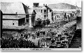 Long before the hour fixed for the ceremonies at the church, Stockton street was literally thronged by men, women and children, almost blocking up the street, from Washington to California street. At the conclusion of the church services, the most imposing procession we ever witnessed in California, was formed, and followed the remains to Lone Mountain Cemetery.