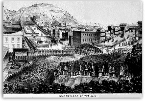 Notwithstanding the great gathering at the funeral, the rooms of the Committee were surrounded by about 20,000 people, who had got an intimation of the proposed execution, and hurried to the spot. The most formidable guard was arranged, which embraced all the arms of the Committee, consisting of about 3,000 stand of muskets and two field pieces. The streets in the immediate vicinity of the rooms were cleared by the soldiers, and the bristling bayonets that were displayed in every direction, made the scene one of great solemnity. One of the field pieces was planted so as to command Davis street from Sacramento street, and the other so as to command Front street.