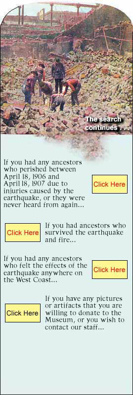 | Special Note: Our entire budget comes through donations. In order to keep this project alive any donation you could possibly make would be greatly appreciated. Please go to our main website at sfmuseum.org for more information about sustaining this valuable part of San Francisco's history | Virtual Museum of the City of San Francisco || Great Earthquake & Fire of 1906 || 1906 Earthquake Photographs || Great Register 1906 List of Dead and Survivors |